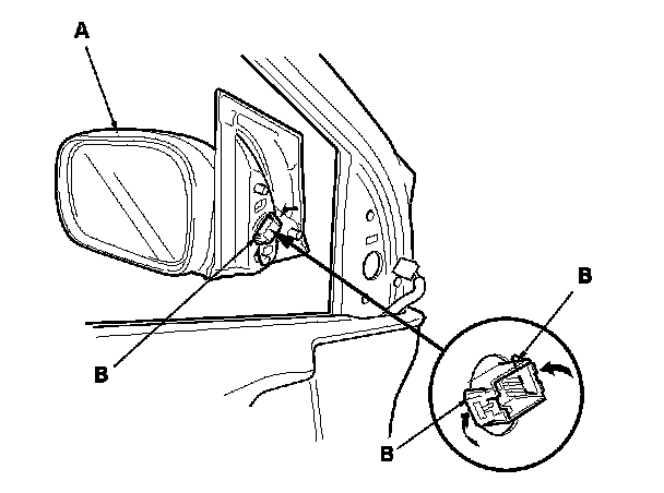 5. While holding the power mirror (A), squeeze the retaining tabs (B), then push out to remove the mirror.