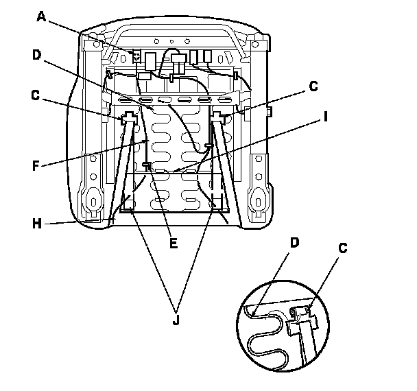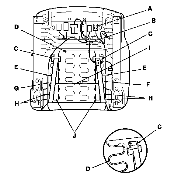 4. Release the hooks (C) from the seat cushion frame spring (D). Remove the wire ties (E), and pull out the side airbag harness (F) and seat-back heater harness (G) (driver's seat with seat heater) through the slits (H) in the seat cushion cover (I). Turn over the seat cushion cover, and release the hooks (J).