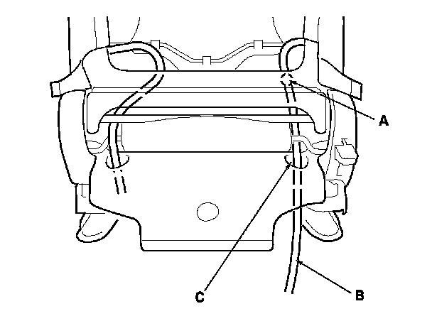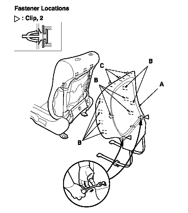 7. Detach the harness clip (A), and pull out the side airbag harness (B) through the harness hole (C) in the seat-back cover and the seat frame. Passenger's seat is shown; driver's seat is similar.