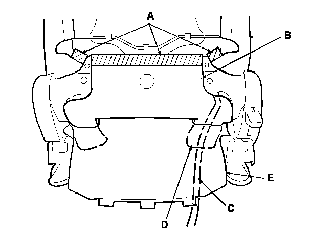 6. Release the hook strips (A), then loosen the seat-back cover (B). Pull out the side airbag harness (C) with the harness guides (D) through holes in the seat cushion cover (E). Passenger's seat is shown; driver's seat is similar.