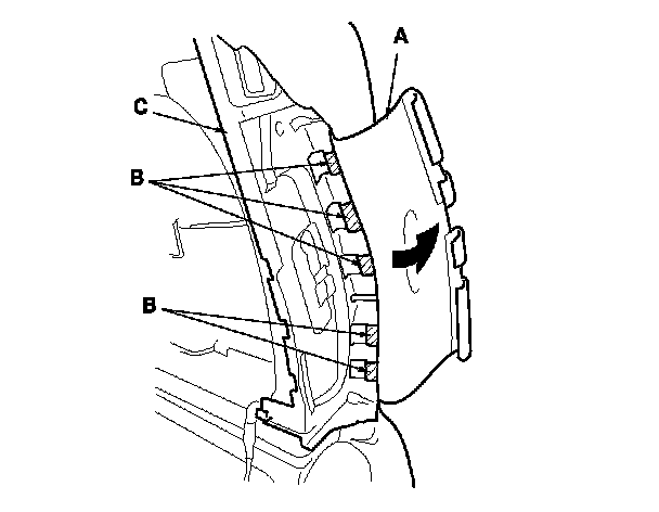 5. Insert a trim pad remover between the bottom of the back panel (A) and the seat frame until it squarely engages one of the clips. Gently pry on the clip until it detaches from the seat frame. Repeat for the other clip. Gently pull back the panel to release the hooks (B), then pull down the panel to release the hooks (C).