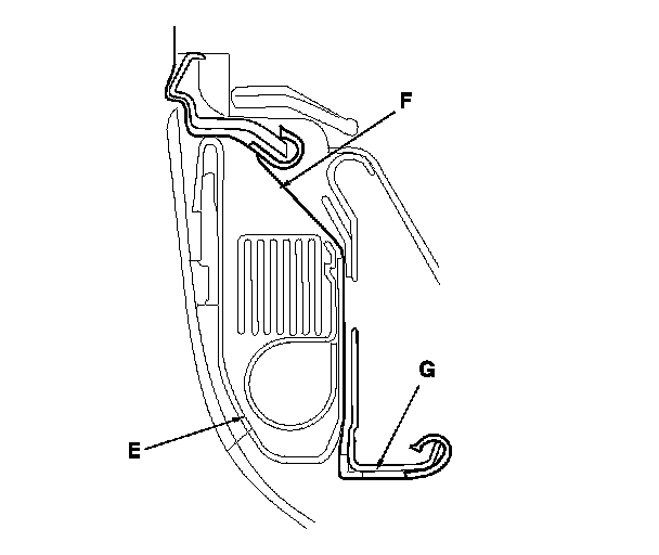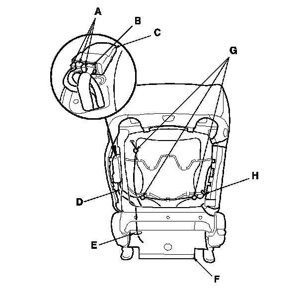 - Before installing the side airbag (E), make sure the reinforcing cloth (F) is fixed on the seat-back frame (G) securely.