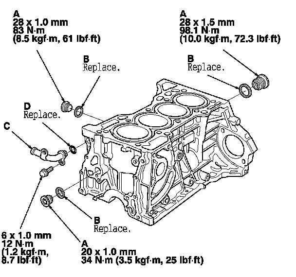 When installing the sealing bolts (A), always use a new washer (B).