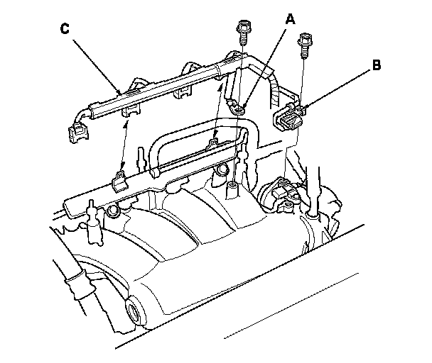 8. Connect the positive crankcase ventilation (PCV) hose (A), the evaporative emission (EVAP) canister hose (B), and the brake booster vacuum hose (C).