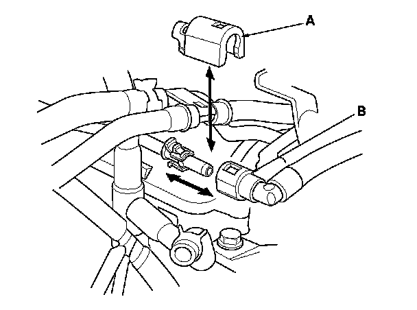 8. Remove the quick-connect fitting cover (A), then disconnect the fuel feed hose (B). Fuel Line/Quick-Connect Fitting Removal