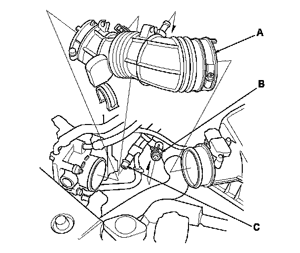 3. Disconnect the vacuum hose (A) and the breather pipe (B), then remove the intake air duct (C).