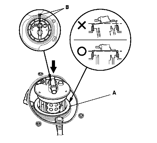1. Temporarily attach a new base gasket (A) to the fuel tank unit (B), then insert the fuel tank unit partially into the fuel tank.