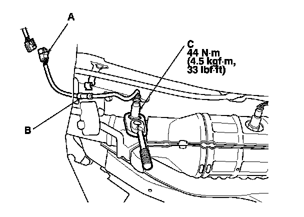 1. Disconnect the A/F sensor 4P connector (A) and the clip (B), then remove the A/F sensor (C).