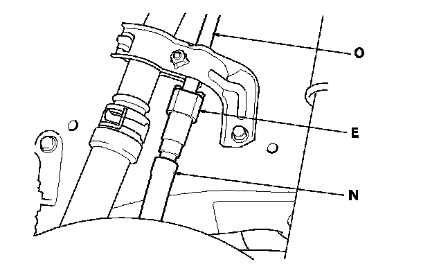 The fuel line/quick-connect fittings (A, B, C, D, and E) connect the fuel rail (F) to the fuel feed hoses (G), fuel feed hose A to fuel feed hose B (H), fuel feed hose B to the fuel line (I), the fuel line (J) to the fuel tank unit (K), the fuel vapor line (L) to the EVAP canister (M) and the fuel tank vapor recirculation tube (N) to the fuel fill pipe (O). When removing or installing the fuel feed hose, the fuel tank unit, or the fuel tank, when disconnecting/connecting the quick-connect fittings, pay attention to the following: