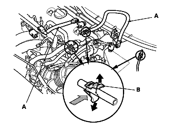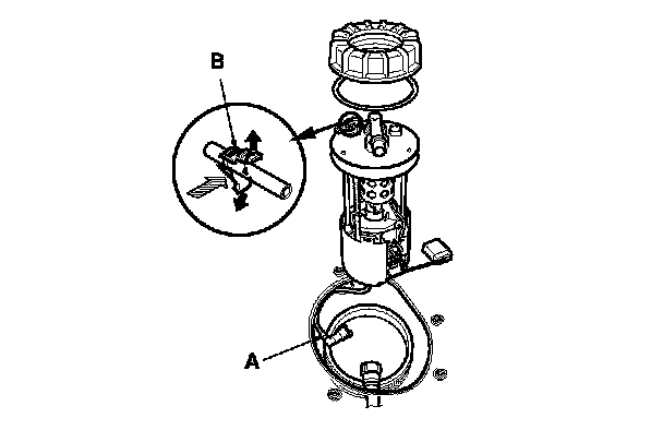 3. Before connecting a new fuel tube/quick-connect fitting assembly (A), remove the old retainer (B) from the mating line.