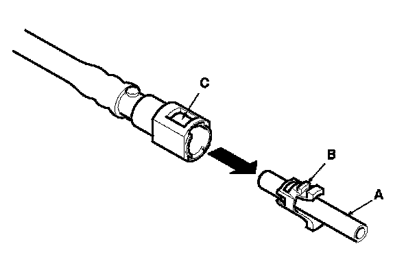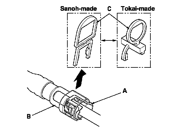 5. When you reconnect the connector with the old retainer, make sure the connection is secure and the tabs (A) are firmly locked into place; check visually and also by pulling the connector (B). When you replace the fuel line with a new one, make sure you remove the ring pull (C) upwards after you confirm the connection is secure.