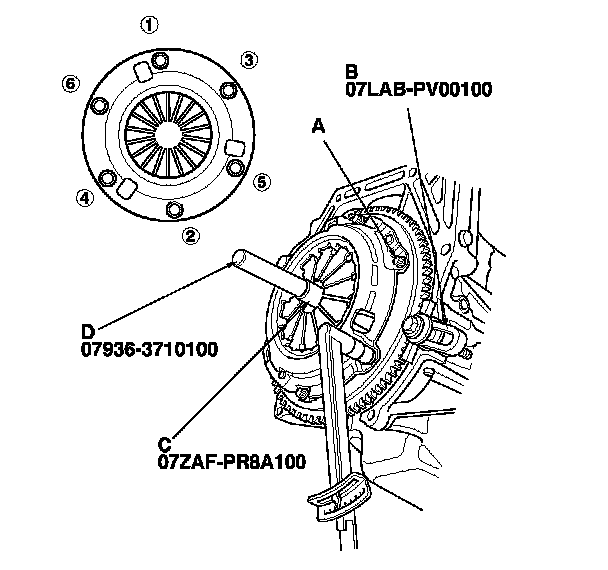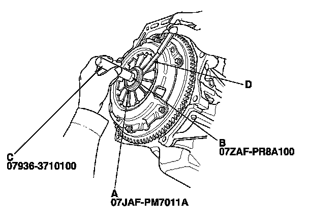 2. Check the evenness of the height of the diaphragm spring fingers using the clutch alignment disc (A), the clutch alignment shaft (B), the remover handle (C), and a feeler gauge (D). If the height difference is more than the service limit, replace the pressure plate.