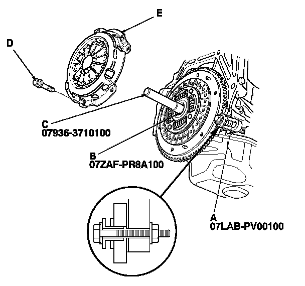 4. To prevent warping, loosen the pressure plate mounting bolts (D) in a crisscross pattern in several steps, then remove the pressure plate (E).