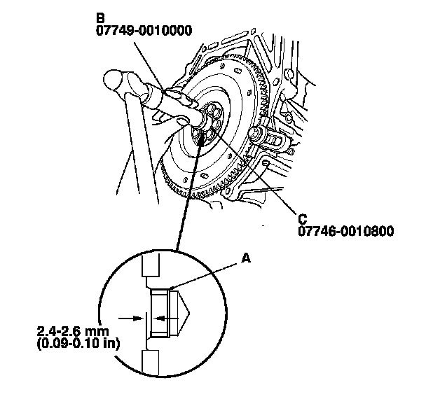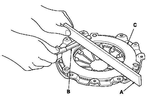 7. Inspect for warpage using a straight edge (A) and a feeler gauge (B). Measure across the pressure plate surface (C). If the most measurement difference is more than the service limit, replace the pressure plate.