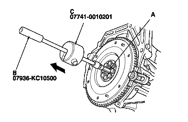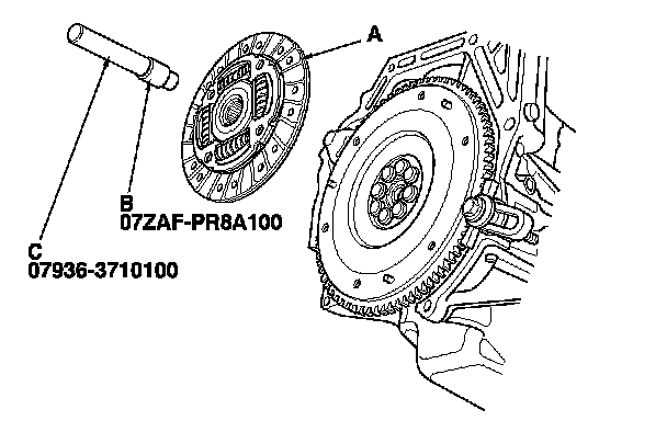 8. Remove the clutch disc (A), the clutch alignment shaft (B), and the remover handle (C).