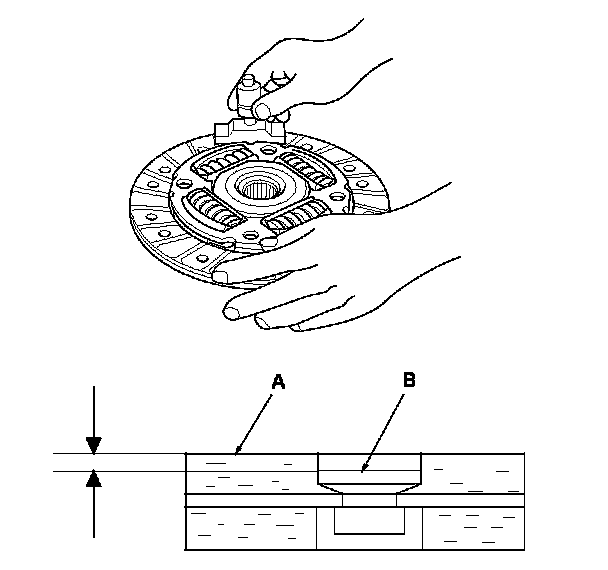 11. Measure the rivet depths from the clutch disc lining surface (A) to the rivets (B) on both sides. If the measurement is less than the service limit, replace the clutch disc.