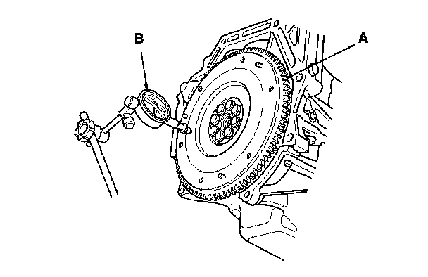 15. Measure the flywheel (A) runout using a dial indicator (B). Through at least two full turns with pushing against the flywheel each time you turn it to take up the crankshaft thrust washer clearance. If the measurement is more than the service limit, replace the flywheel, and recheck the runout; go to step 16.