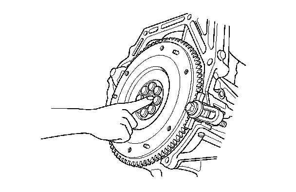 17. Loosen the flywheel mounting bolts in a crisscross pattern in several steps. Remove the bolts, then remove the flywheel and the ring gear holder.