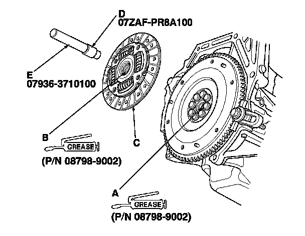 26. Apply super high temp urea grease (P/N 08798-9002) to the splines (B) of the clutch disc (C), then install the clutch disc using the clutch alignment shaft (D) and the remover handle (E).