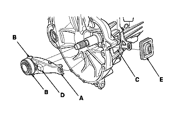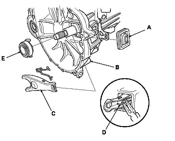 8. Install the release fork boot (E). Make sure the boot seals around the release fork and the clutch housing.