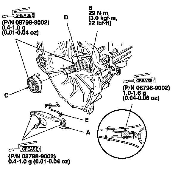 5. Apply super high temp urea grease (P/N 08798-9002) to the release fork (A), the release fork bolt (B), the release bearing (C), and the release bearing guide (D) in the shaded areas, then set the release fork set spring (E).
