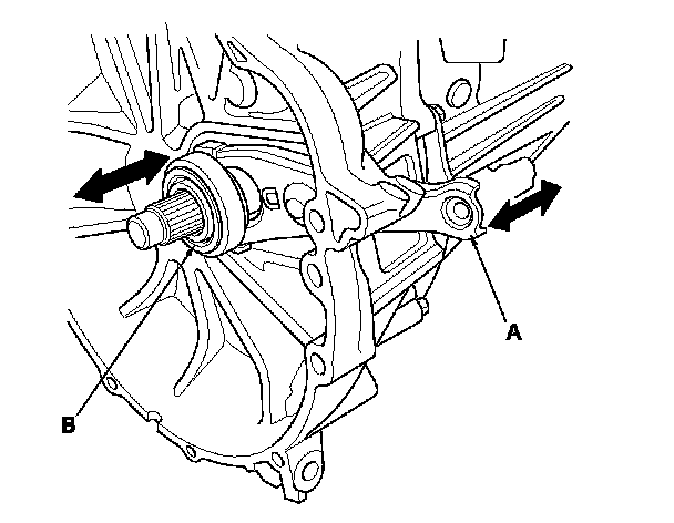 9. Move the release fork (A) right and left to make sure that it fits properly against the release bearing (B), and that the release bearing slides smoothly.