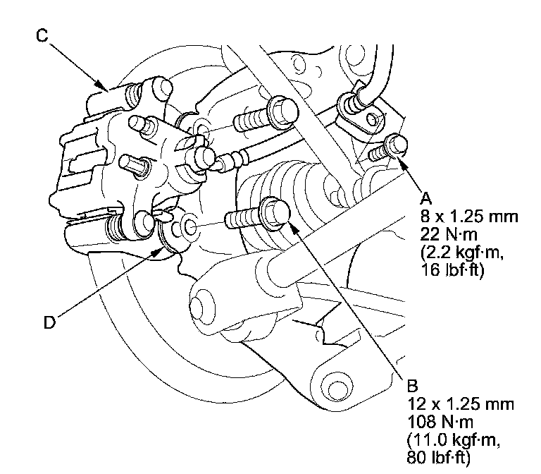 5. Remove the brake caliper bracket mounting bolts (B), and remove the caliper assembly (C) from the knuckle. To prevent damage to the caliper assembly or brake hose, use a short piece of wire to hang the caliper assembly from the undercarriage. Do not twist the brake hose and the parking brake cable excessively.