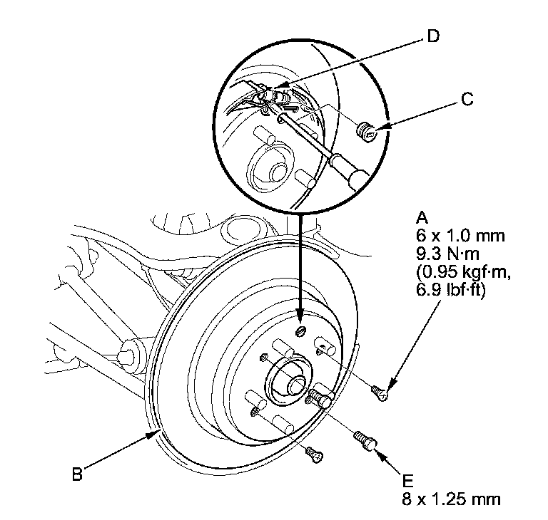- If the brake disc/drum is stuck to the hub bearing unit, thread two 8 x 1.25 mm bolts (E) into the brake disc/drum to push it away from the hub bearing unit. Turn each bolt 90 degrees at a time to prevent the brake disc/drum from binding.