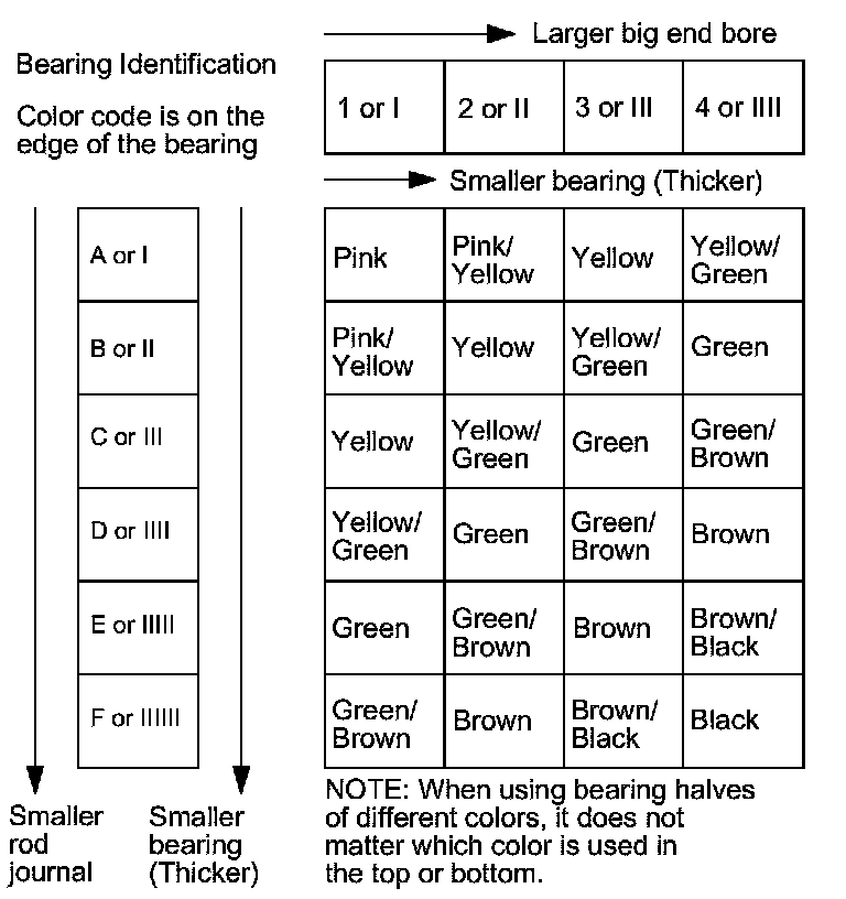 7. If the plastigage shows the clearance is still incorrect, try the next larger or smaller bearing (the color listed above or below that one), and check the clearance again. If the proper clearance cannot be obtained by using the appropriate larger or smaller bearings, replace the crankshaft and start over Crankshaft And Piston Removal.