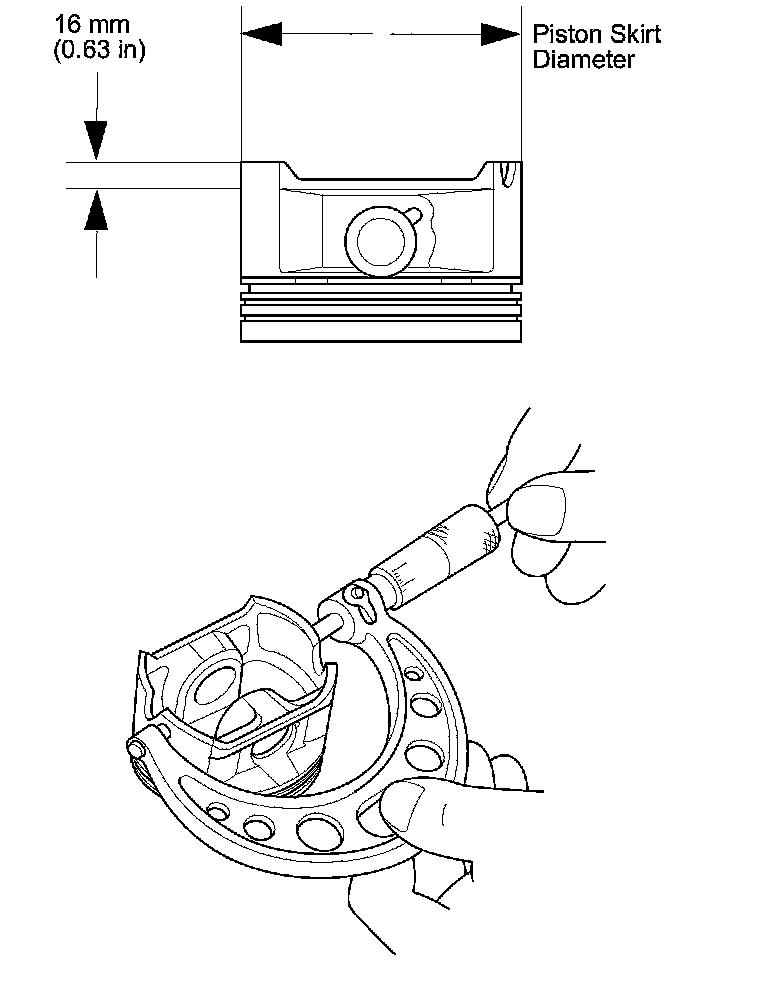 3. Measure the piston skirt diameter at a point 16 mm (0.63 in) from the bottom of the skirt.
