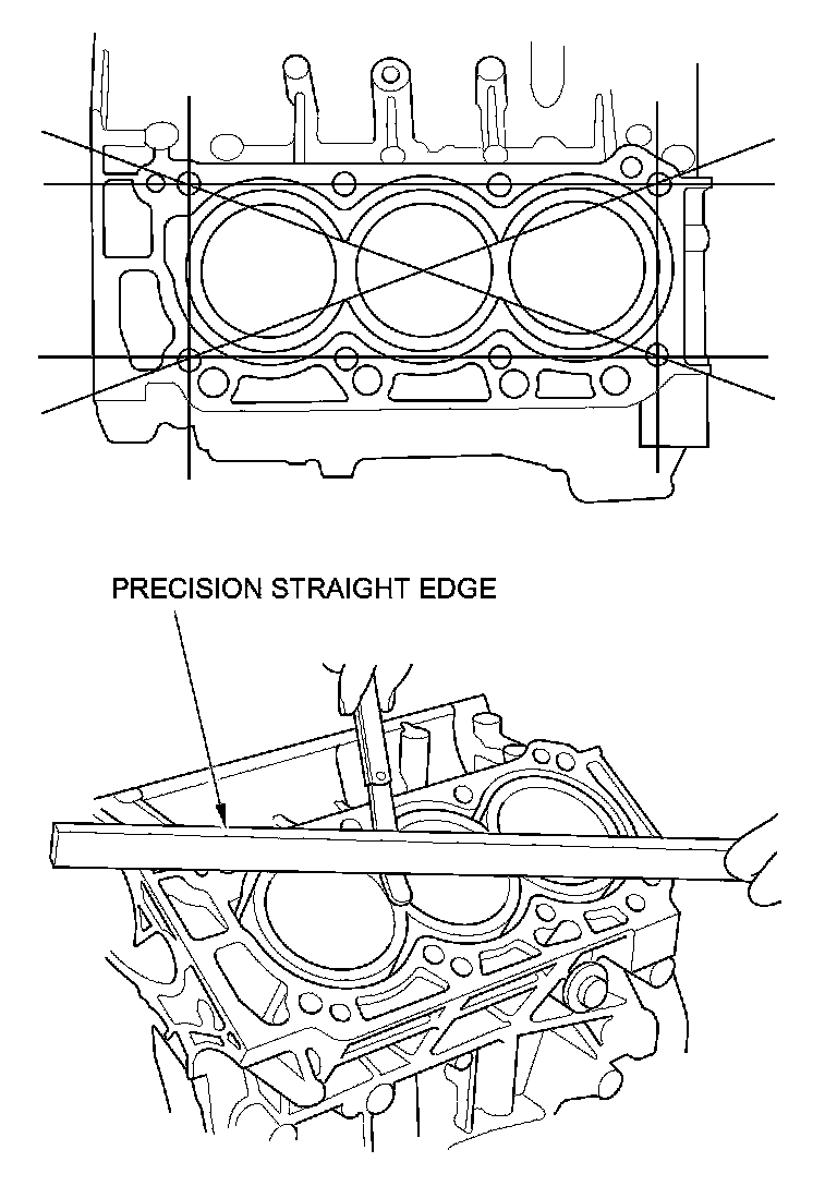 6. Check the top of the engine block for warpage. Measure along the edges and across the center as shown.