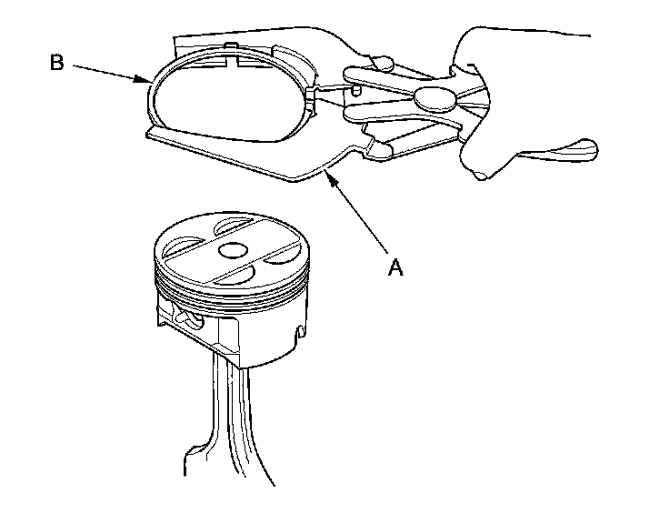 2. Using a ring expander (A), remove the old piston rings (B).