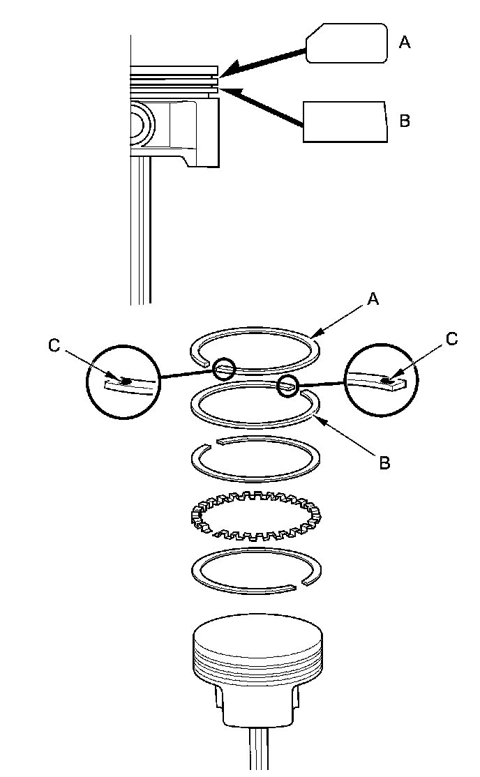 6. Install the rings as shown. The top ring (A) has a 1D mark and the second ring (B) has a 2X mark. The manufacturing marks (C) must be facing upward.