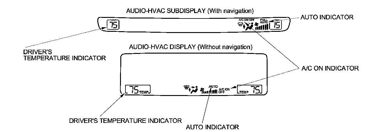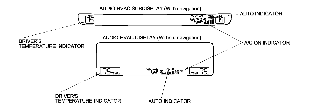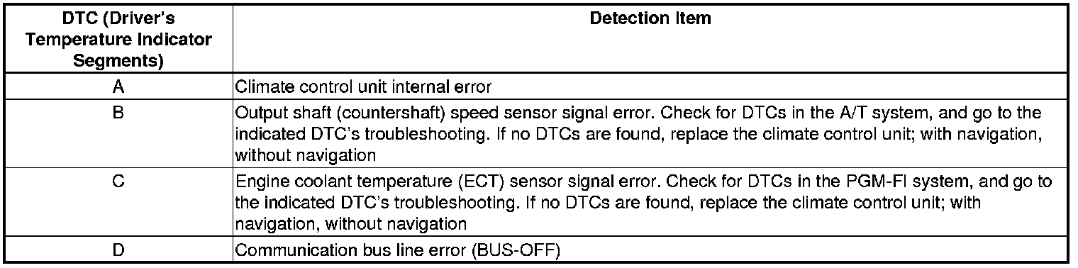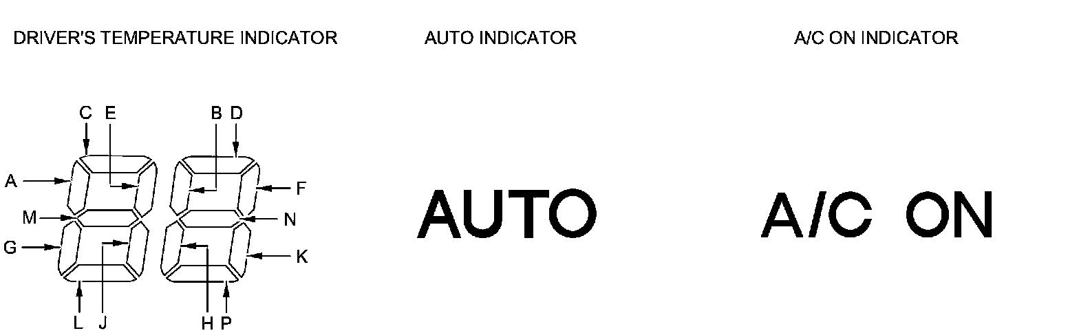NOTE: If the driver's temperature indicator segments A, C, D, E, G, J, K, and the AUTO indicator or the A/C ON indicator are on at the same time, there may be an open in the climate control unit ground circuit.