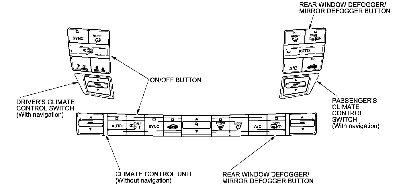 2. Press and hold the ON/OFF button, then within 10 seconds press and release the REAR WINDOW DEFOGGER/MIRROR DEFOGGER button five times. Release the ON/OFF button; then the self-diagnosis begins.