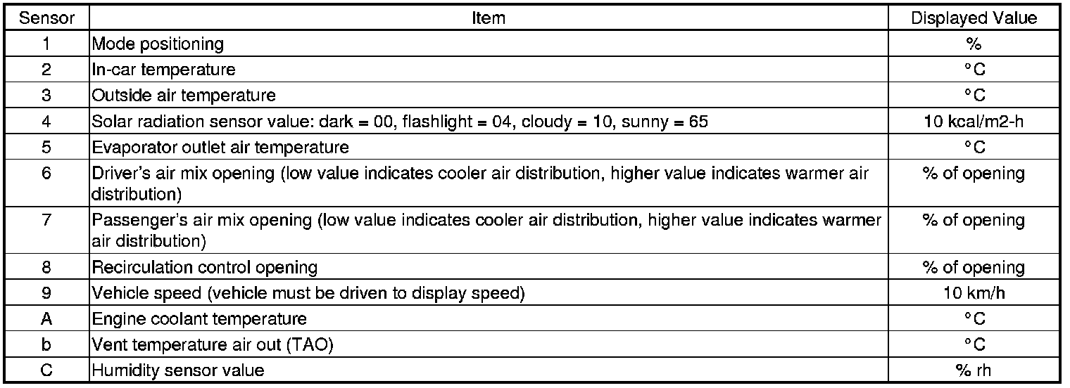 The climate control unit has a mode that displays sensor inputs it receives. This mode shows you what the climate control unit is receiving from each of the sensors, one at a time, and it can help you determine if a sensor is faulty.