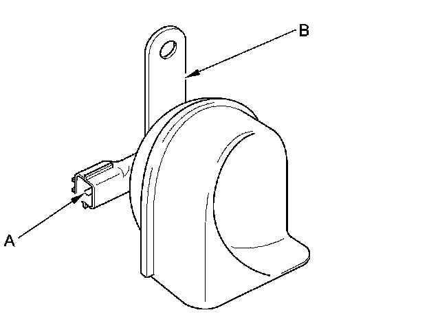 3. Test the horn by momentarily connecting battery power to the terminal (A) and grounding the bracket (B). The horn should sound.