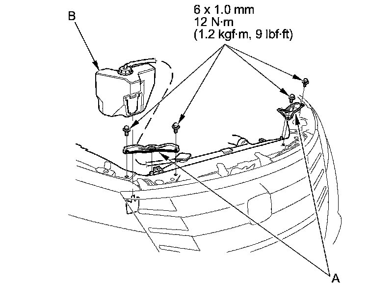 4. Remove the bolts and the radiator upper brackets (A). Remove the coolant reservoir (B).