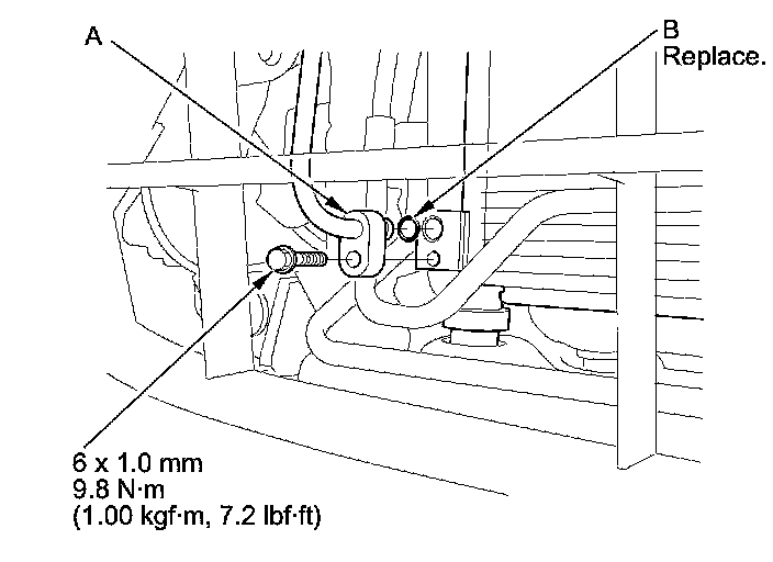 5. Remove the bolt, then disconnect the receiver pipe (A) from the A/C condenser. Remove the O-ring (B).