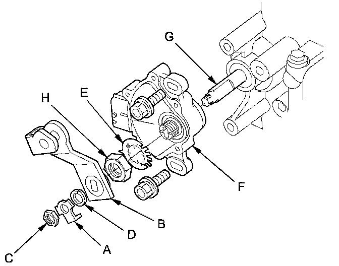 9. Pry the lock tabs of the lock washer (E) on the transmission range switch (F), hold the selector control shaft (G) with a 6.0 mm wrench, and loosen the locknut (H).