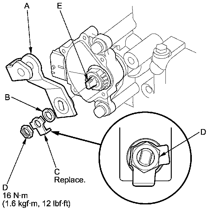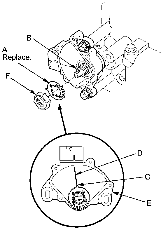 14. Install a new lock washer (A) over the selector control shaft (B) by aligning the indicator tab (C) of the lock washer with the N positioning line (D) on the transmission range switch (E), and install the locknut (F).