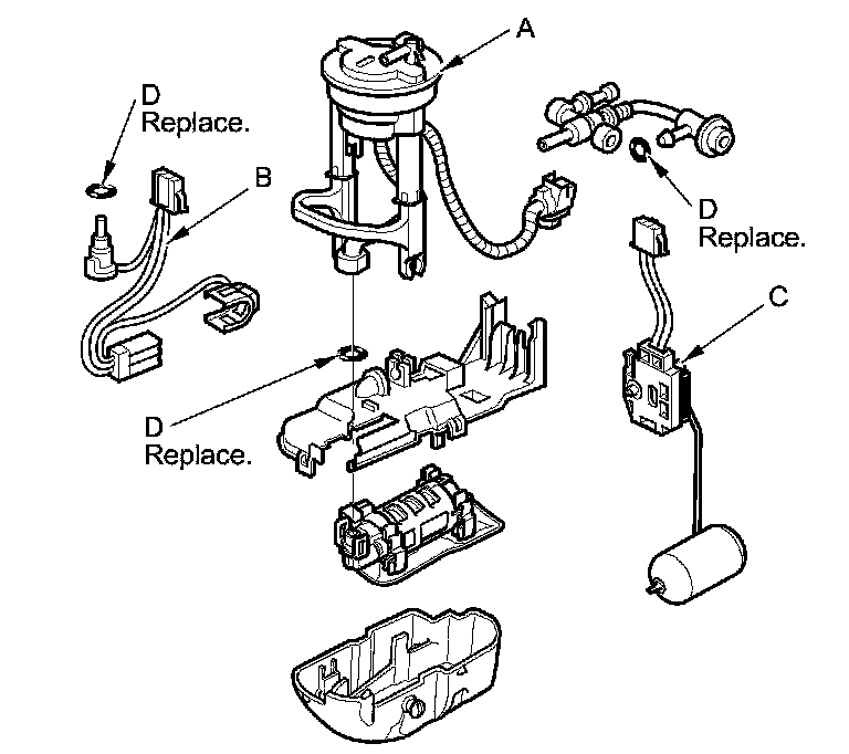 4. Install the parts in the reverse order of removal with new O-rings (D). When installing the fuel tank unit, align the marks on the unit and the fuel tank.