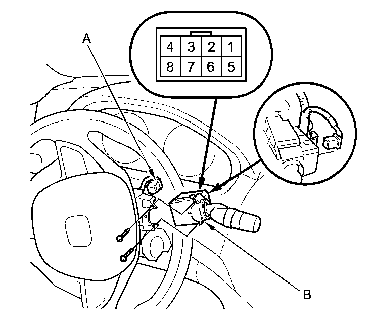 2. Disconnect the dashboard wire harness 8P connector (A) from the wiper/washer switch (B).