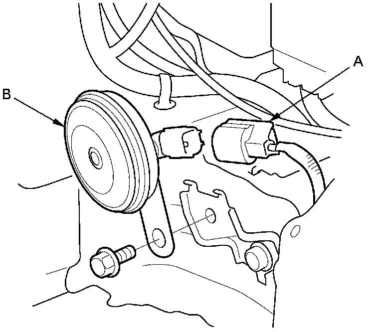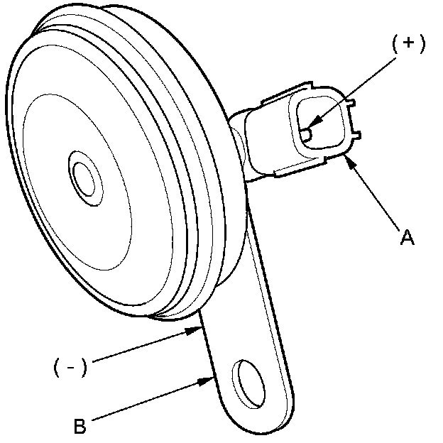 3. Test the horn by connecting battery power to the terminal (A) and grounding the bracket (B). The horn should sound.