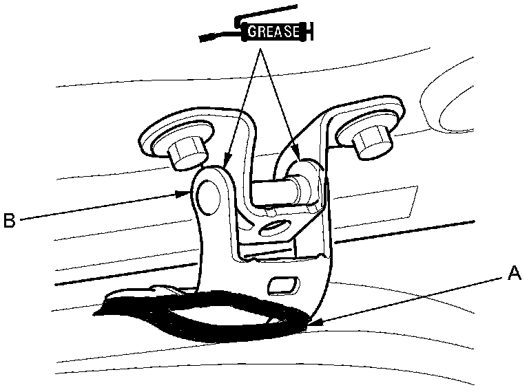9. Apply new body seam sealer into the cracks in the sealed area (A) around the tailgate hinge (B), and let the sealer dry.