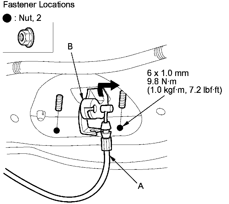 2. Disconnect the tailgate opener cable (A) from the tailgate handle (B), and remove the nuts. Take care not to kink the cable.