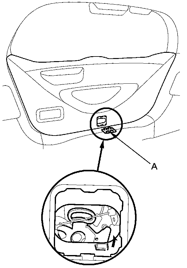 - If the tailgate latch does not unlock by using the keyless entry transmitter or unlocking the driver's door lock, remove the maintenance lid (A) from the tailgate lower trim panel. Unlock the tailgate latch by turning the lock lever counterclockwise as shown. Open the tailgate by pulling the tailgate handle.