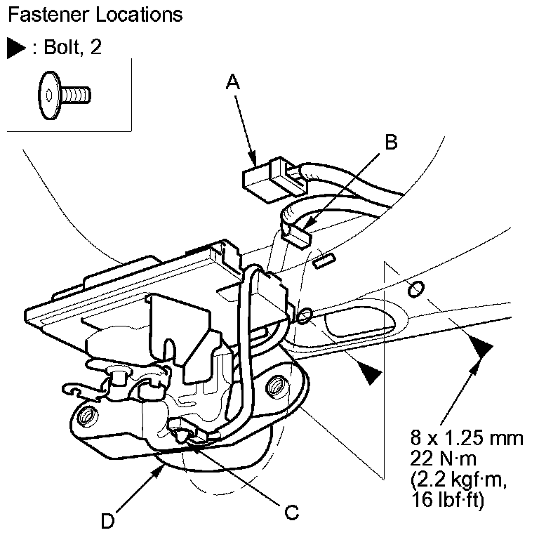 5. Remove the bolts, then pull out the tailgate latch (D) from the tailgate.