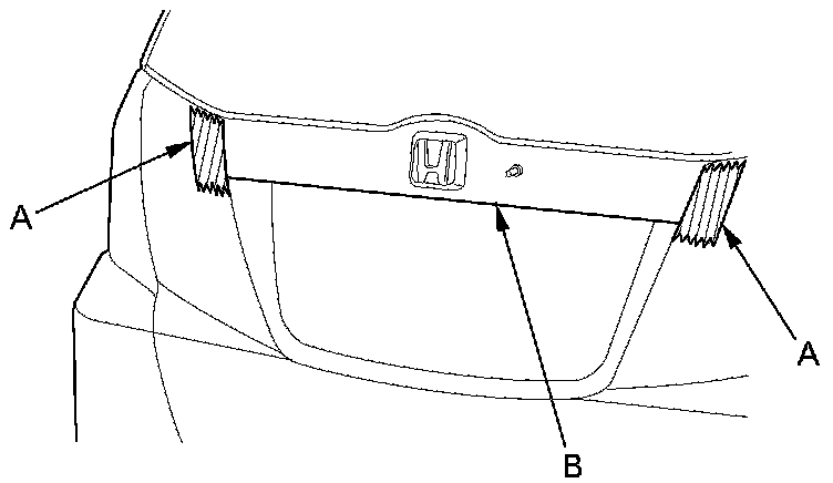4. Apply protective tape (A) to the tailgate beside both side edges of the rear license trim (B) as shown.