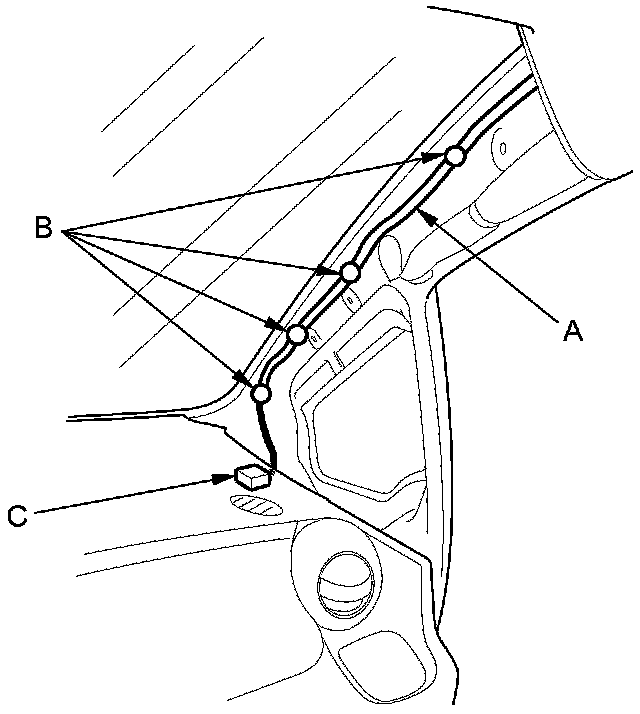 5. Remove the antenna lead (A) by detaching the harness clips (B) from the passenger's side A-pillar, and disconnecting the antenna lead connector (C).